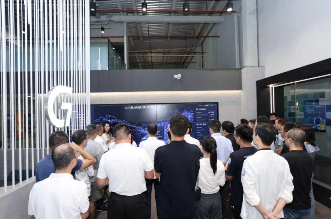 在G7易流北京总部,在展厅中G7市场负责人向到访光谷瞪羚企业家介绍了公司发展历程及核心实力,并通过展厅大屏、设备体验,展示了G7的一体化数字服务平台以及软硬一体、全链贯通的SaaS服务。