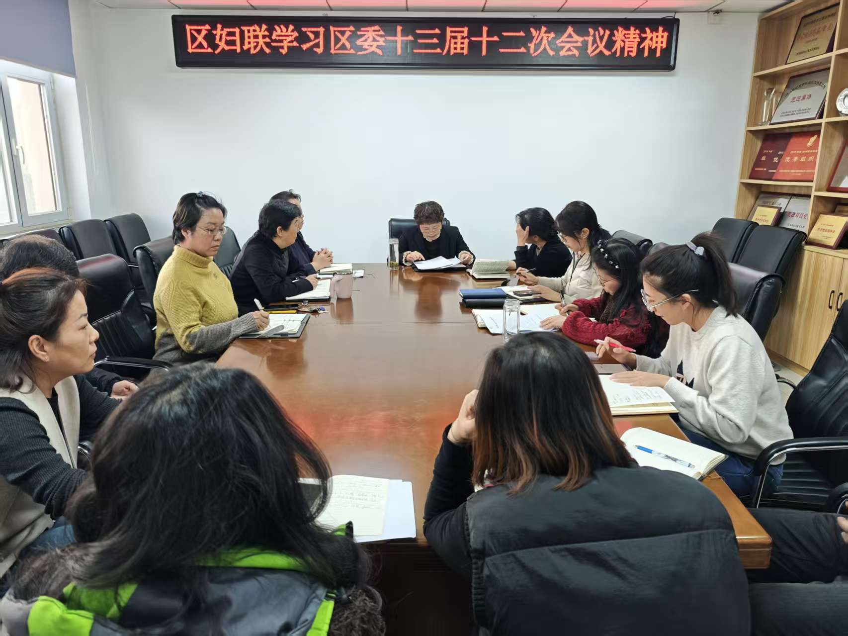 会议要求,要深入学习贯彻区委十三届十二次全会精神,准确把握“十五五”时期全区发展的主题主线、目标任务和战略举措,切实将全会精神转化为推动妇女儿童事业高质量发展的强大动力和具体实践。一是要深学细悟,在领会精神实质上见行见效。 通过集中学习、交流研讨等多种形式组织全员学习,确保学深悟透、融会贯通。二是要聚焦主业,在服务发展大局上精准发力。 深入实施“科技创新巾帼行动”“巾帼就业创业促进行动”“乡村振兴巾帼行动”,支持女性科技人才成长成才,培育乡村振兴巾帼带头人;做实维权关爱服务,健全多部门联动维权机制,维护妇女儿童合法权益;落实“家家幸福安康工程”,加强家庭教育指导服务,做好困境儿童关爱、妇女“两癌”筛查救助等民生实事,让现代化建设成果更多更公平惠及我区妇女儿童和家庭。三是要深化改革创新,在激发组织动能上担当作为。坚持党建引领,持续巩固妇联组织改革成果,加强“妇女之家”“儿童之家”等阵地建设,延伸工作手臂;创新工作机制和服务载体,提升服务妇女儿童的能力和水平,打造一支政治过硬、业务精湛、作风优良的妇联干部队伍,推动我区妇女儿童事业实现新发展。