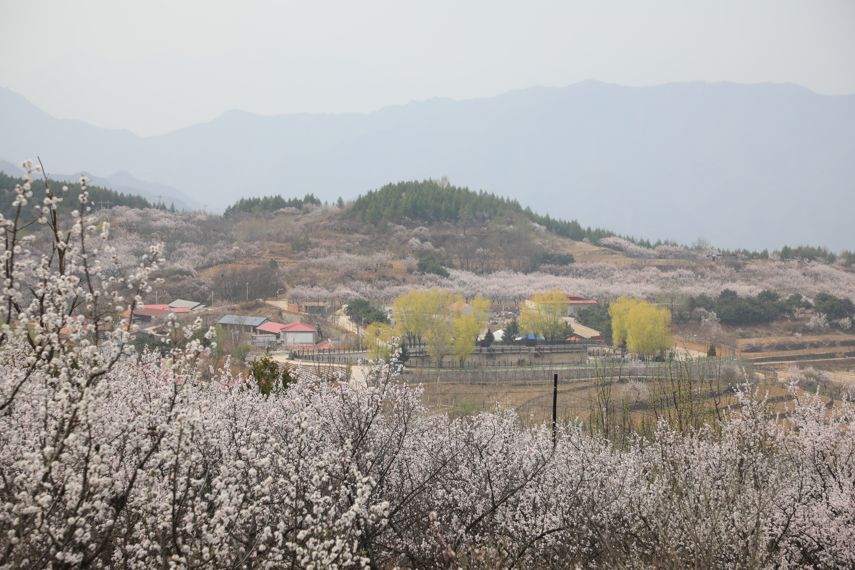 近日,清水镇黄安坨村及周边山间的杏花竞相绽放,漫山遍野的粉白色山杏花肆意铺展,从山脚梯田层层漫向百花山腰,与错落有致的古村落相互呼应。远望如云似雪,近观花瓣透润,薄薄的阳光穿过枝隙,在地上洒下细碎的光斑。微风拂过,花瓣纷纷扬扬,如一场温柔的香雪,空气里浮动着清甜的气息,引得蜂蝶流连。